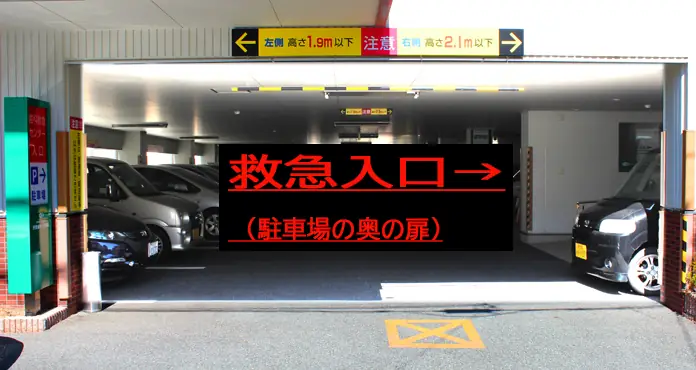 正面入口から左折すると、右手に1F屋内駐車場があります。その奥の右手が急患入口となります。