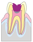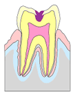 - むし歯が象牙質まで広がり歯の表面に穴が開いた状態。冷たい物や甘い物がツーンとしみるようになります。むし歯になっている部分を取り除き形を整えてから、金属やプラスチックをつめる治療をします。