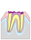 - むし歯が象牙質まで広がり歯の表面に穴が開いた状態。冷たい物や甘い物がツーンとしみるようになります。むし歯になっている部分を取り除き形を整えてから、金属やプラスチックをつめる治療をします。